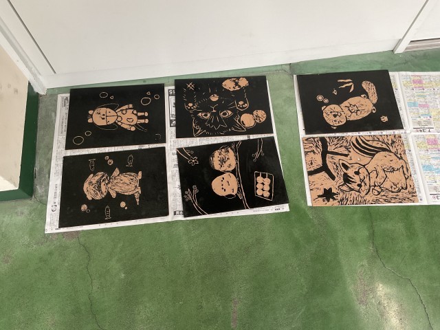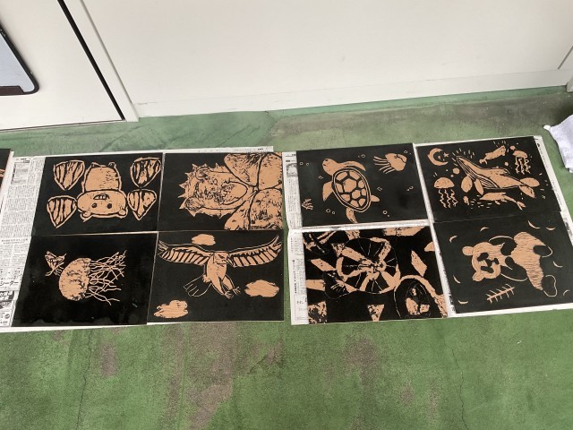 2月15日。5年生の廊下には素敵な作品が並んでいました。念入りに彫っているものもありました。