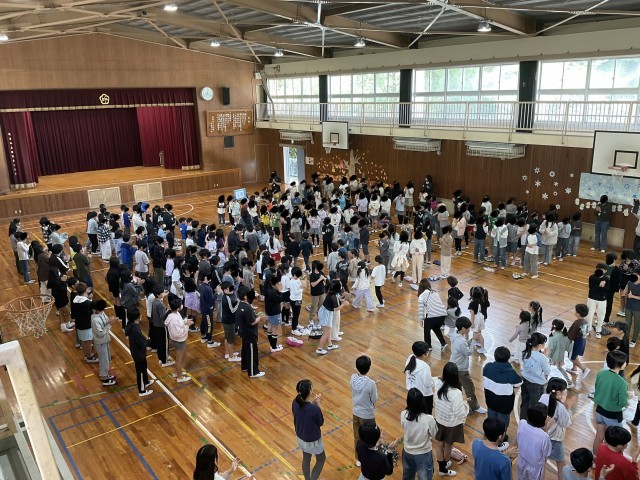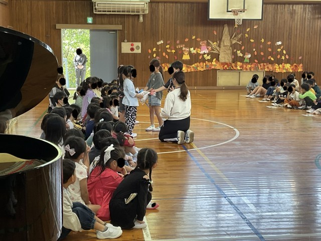 4月22日。全児童が一堂に会し、対面式を行いました。1年生は入学してから2週間以上がすぎ、少しずつ小学生らしくなってきました。上の学年の児童からは言葉、歌、花の種の贈り物がありました。