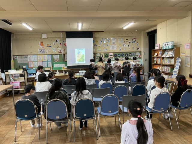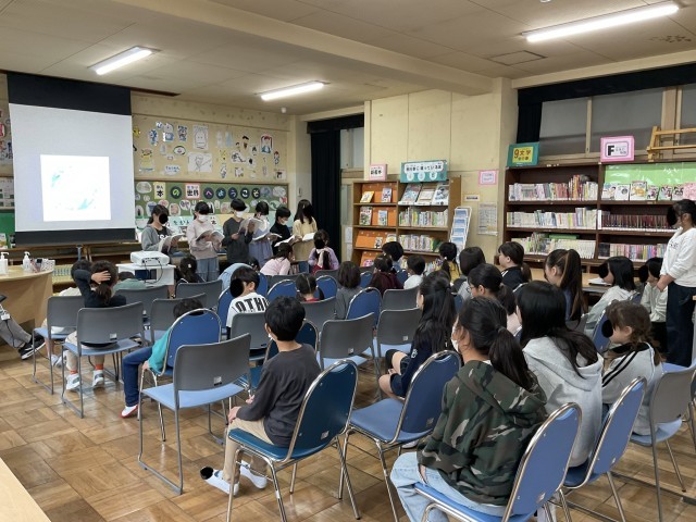 4月24日。6年生が図書室で国語の教科書を朗読しているところに今日はたくさんの低学年の児童が聞きにきていました。お話会として、聞く児童にとっても豊かな時間となりました。