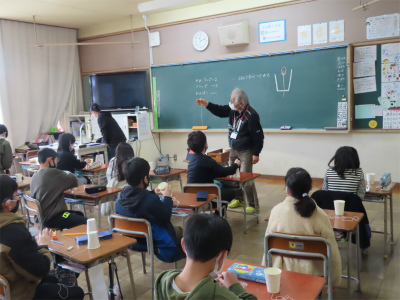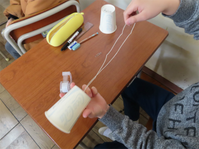 3年生では、理科で、糸電話作りに取り組んでいました。紙コップに穴をあけて、糸を通し、結んで、糸電話を作っていました。うまくできて、お話が良く聞こえるようにできますように。