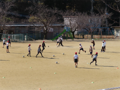 6年生の体育では、運動場で曲に合わせてリズム縄跳びをして、体を温めます。その後は、サッカーボールを使ってのパス練習です。ボールを足で操るのは、ちょっと難しそうでしたね。