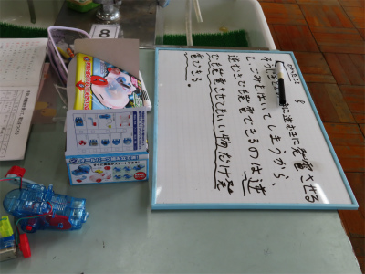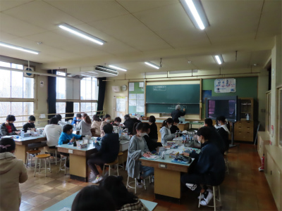 6年生の理科専科の授業を、理科室で行っていました。手動の発電機を使って、実験し、分かったことを班ごとにまとめて、発表のボードに書いていました。