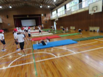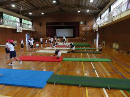 3年生の予定は、初めての水泳でしたが、生憎の雨模様で、水温も気温も低く延期となりました。それに代えて、これまでのマット運動のおさらいをして、技が一つずつきれいにまっすぐできるように練習していました。