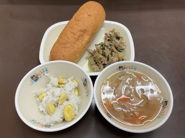 10月に入ってもまだまだ日中は暑い日が続いていますが、朝晩はひんやり秋の訪れを感じます。今日は秋らしい「栗」メニューです。栗おこわは、栗が甘くて美味しかったです。【献立】栗おこわ・豚肉のオイスターソース炒め・野菜スープ・ごまパン・牛乳