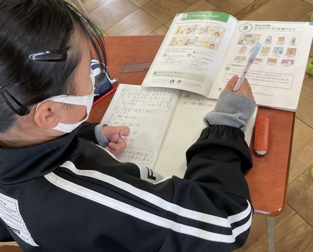 「出したお金ー代金=おつり」の言葉の式を意識して、ひとまとまりの数をかっこを使う学習です。日頃の買い物の際に、どんな計算をしているか振り返っています。おつりなく、ぴったしに使い切ると嬉しくなりますね。