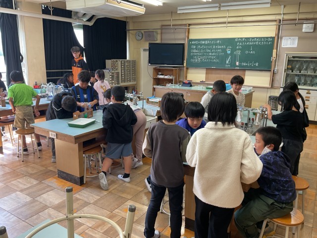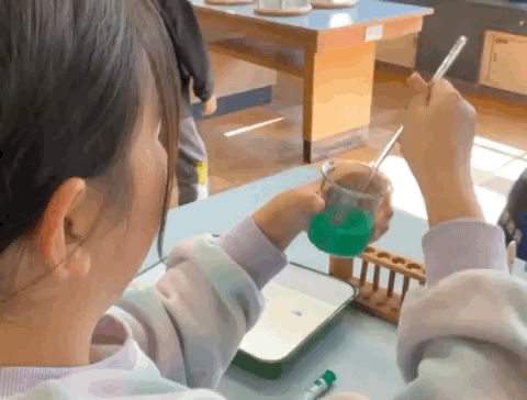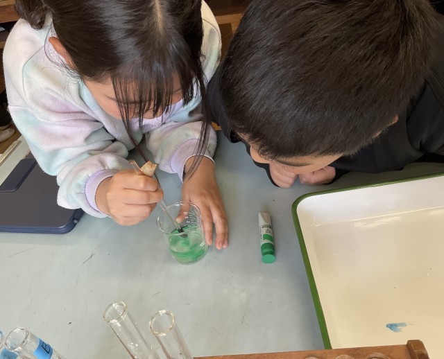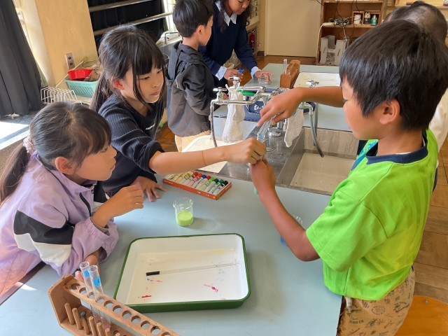 理科室の使い方や実験にはルールがたくさんあります。今回は理科室や実験器具の使い方を学ぶために、絵の具を使ってわかりやすく学んでいます。図工で使う絵の具を試験管に入れて混ぜると理科の実験に思えるのは不思議ですね。