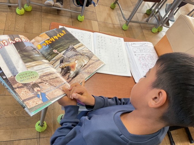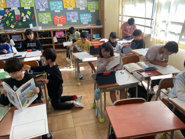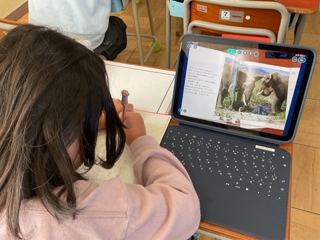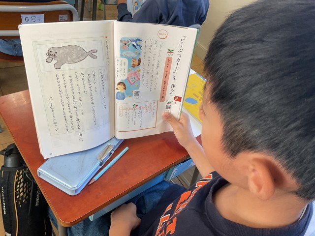 「しらべたことをせいりして動物カードをつくろう」では、ノートにまとめた4つのとくちょうをわかりやすくカードに整理していきます。先生からはわかりやすく見えるポイントの説明がありました。一人ひとりの工夫された動物カードが楽しみですね。