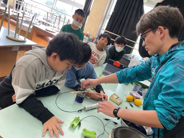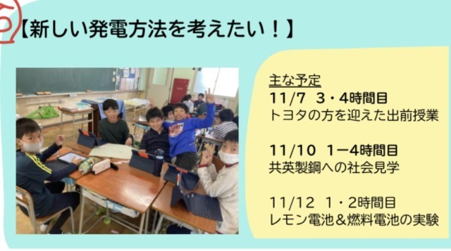11月28日(金)オープンスクールでの発表をゴールに各グループで課題を設定し、ゴールに目指して取り組んでいます。「新しい発電方法を考えたい」では、理科の先生の協力のもと、“レモン“を使い発電できるか実験を試みていました。結果も含めてさらに学びを深めていきます。