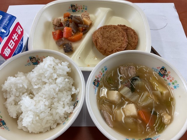 11月18日(火)おいしい給食(冬野菜なべ) 公開日 2025/11/19 更新日 2025/11/19 おいしい給食 寒い季節の温かいなべ料理は体も心も温めてくれます。たっぷりの野菜が入った「冬野菜なべ」とじゃこてんがとてもごはんとあっておいしかったです。【献立】冬野菜なべ・じゃこてん・ちくぜんに・ごはん・牛乳 いいね(0)