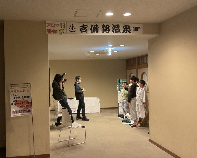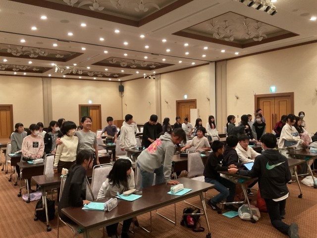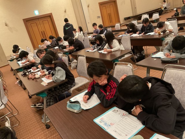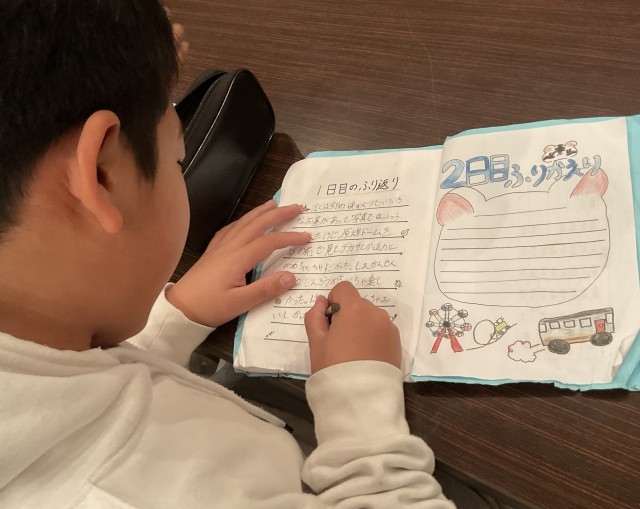 「振り返り」と「レクレーション」の時間です。今日1日で思い出に残った事を友達と共有しながら書き留めています。先生は「平和セレモニー」での頑張りをたたえてくれました。この「振り返り」の時間がとても大切です。「レクレーション」では、ポイント制のゲームで盛り上がりましたね。優秀チームには朝食バイキングの優先券がプレゼントされました☺️お風呂上がりは撮影スポットになっていました♨️
