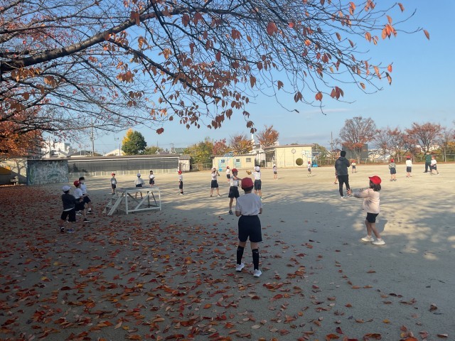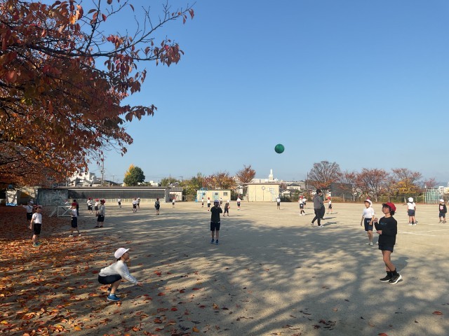 今日はお天気も良く、運動場での体育も快適でした。ボール運動では、相手がボールを受け取りやすいように投げる練習です。