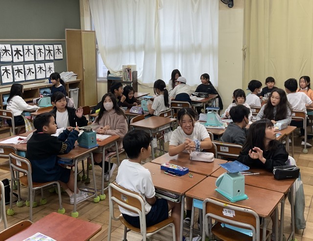 授業の前半は1tが1000kgであるということをおさえながら練習問題に取り組んでいました。そして、今日一番に盛り上がったのは、「はかり」を使い1kg・2kgのピタリ賞をねらい、身近なもので実験している時間でしたね。たくさんの気付きがあったのではないでしょうか?