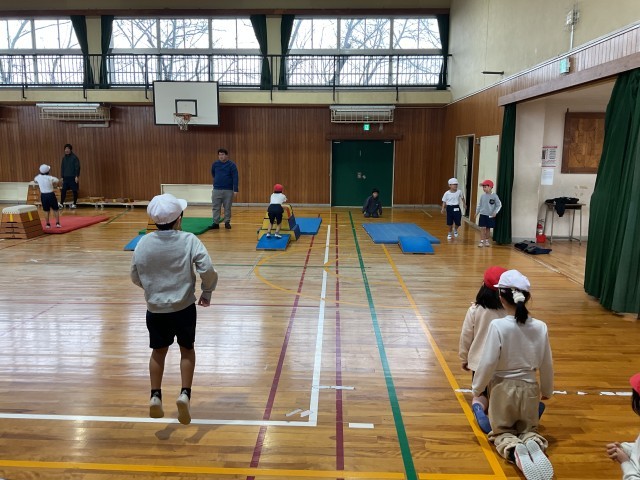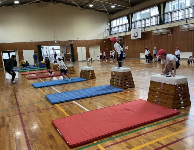 跳び箱に慣れるためにも、楽しく安全にを心がけています。先生の指示にあわせて、まずは楽しくいろんな跳び方に挑戦ですね。