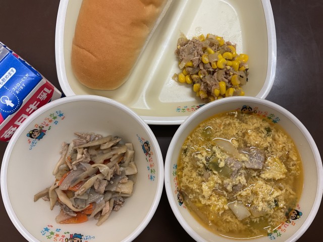 【献立】サンラータン・エリンギのいためもの・ツナコーン・コッペパン・牛乳