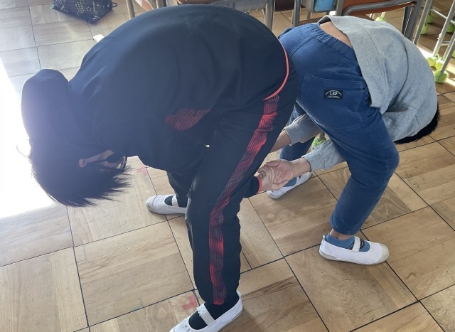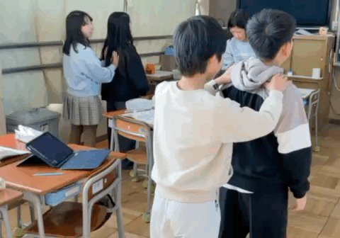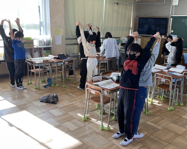 「不安や悩みの対処」について、ぐっすり寝たり、音楽聴いたり、ユーチューブ観たりと色々な方法を試しているようです。教科書では体をリラックスする方法の説明があり、早速ペアで体験していました。リラックスできましたか?