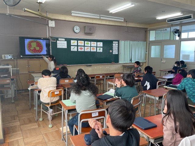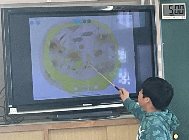 「オリジナルピザを紹介しよう」では、一人ひとりがおいしそうなピザを作り、ピザのポイントとなる内容を紹介してくれていました。ピザ屋さんでも外国語で伝えられそうですね。