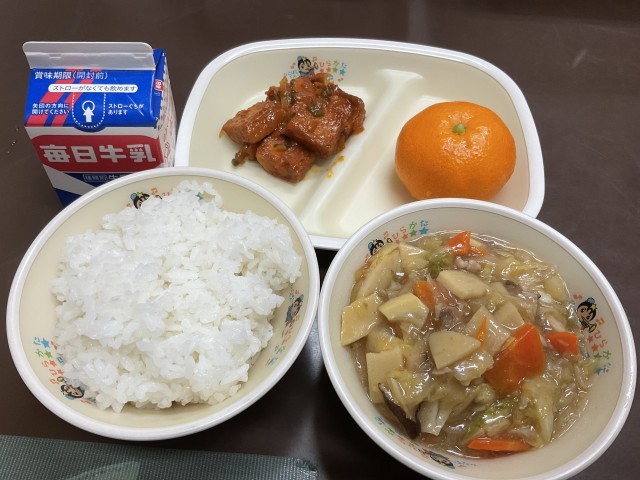 今日の「厚揚げのチリソース」にはピリッと辛い調味料の豆板醤が使われています。このソースがご飯に良く合います。「八宝菜」も野菜がたくさん入っていて、とろみもほどよく効いており体が温まりました。みかんも食べるとお腹いっぱいになりました。