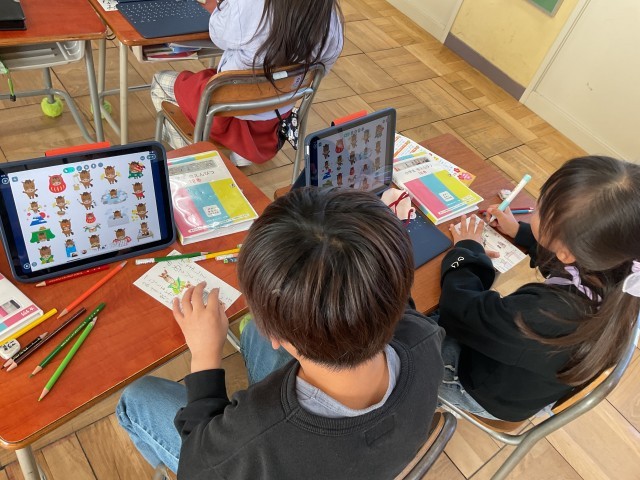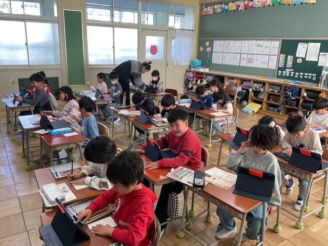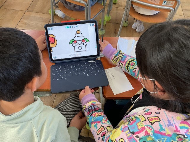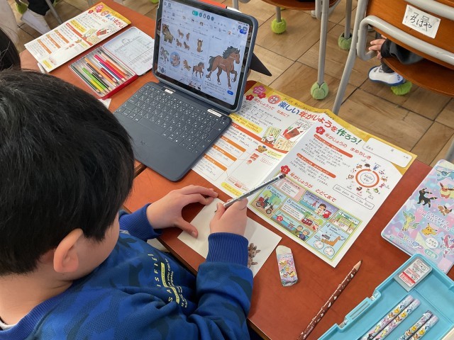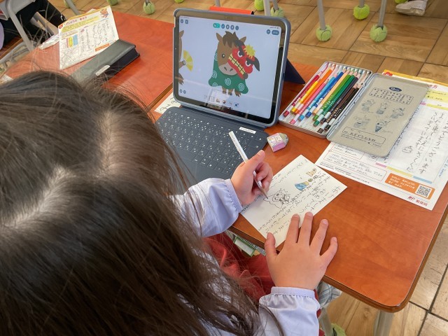 生活の時間を使って年賀状作りです。大切なポイントをおさえながら、かわいいお正月の絵を描いていました。年賀状を送る相手は誰ですか?