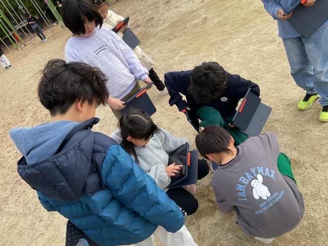 生活科ではタブレットを片手に冬を感じる植物の観察です。この時期でしか感じられない冬の様子をパチリと写真におさめています。寒い運動場でもみんな元気です😌