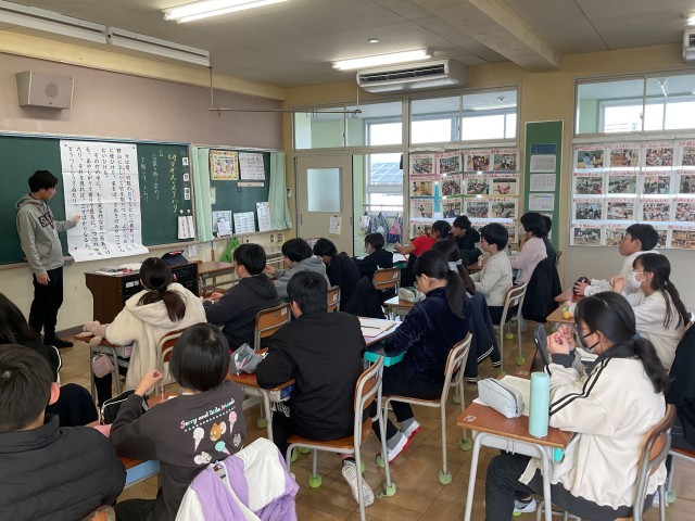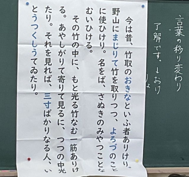 言葉が変化した理由とこれからの言葉の向き合い方を考える授業です。日頃から取り組んでいる「暗唱」の「竹取物語」の文章から、移り変わった言葉の理解を図っていました。