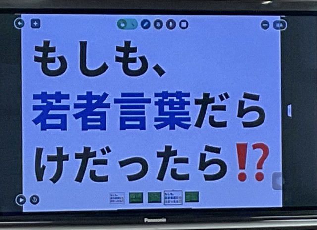 「襟巻き(えりまき」▶︎「マフラー」(外国からの文化) 「保母さん」▶︎「保育士」(価値観の変化) 「携帯電話」▶︎「スマホ」(時代の変化)」など言葉の変化の理解から、「言葉の移り変わり」=「思いやり」であり、相手に合わせた言葉を選ぶ大切さを学ぶ時間となったようです。