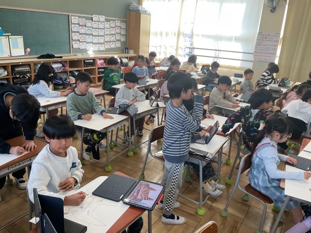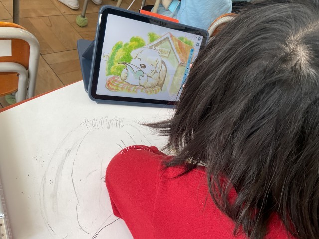 物語「にゃーご」の絵をお手本に作品作りが始まっています。画用紙いっぱいに大きな絵を描くことがポイントですね。