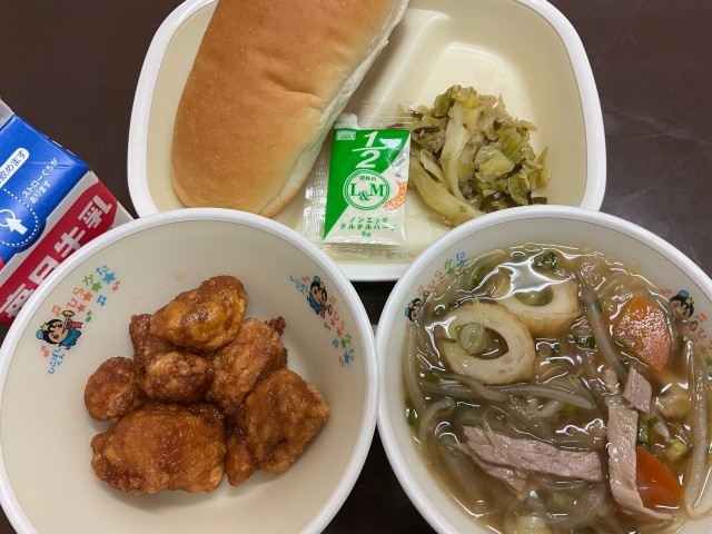 給食週間2日目は、宮崎県の郷土料理「チキンなんばん」です。「南蛮」(なんばん)とは、ポルトガル人や、その文化を意味します。今回はとりにくを油であげて、甘酸っぱいタレがかけられていました。ノンエッグタルタルソースをかけてとてもおいしくいただきました。ツルツルタイピーエンもおいしかったです。