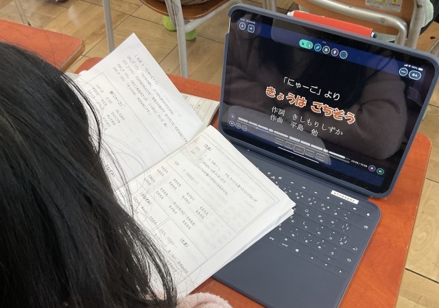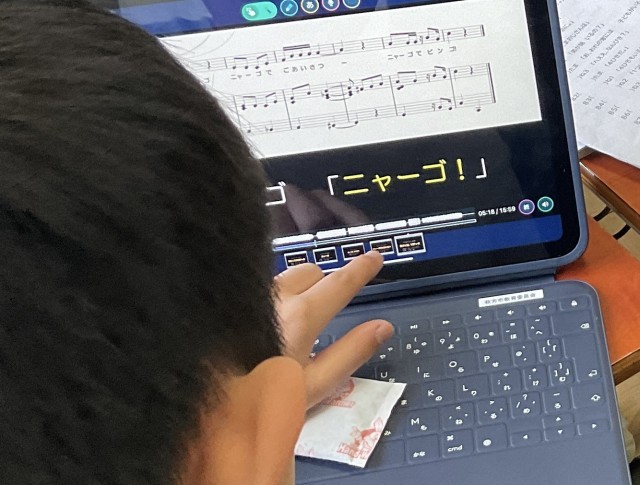 「にゃーご」の練習を進めています。動画で歌詞を覚えたり、歌のスピードを繰り返し確認していました。スピードや曲調が変わるので難しそうですが、楽しく物語の世界に入り込んでいます。
