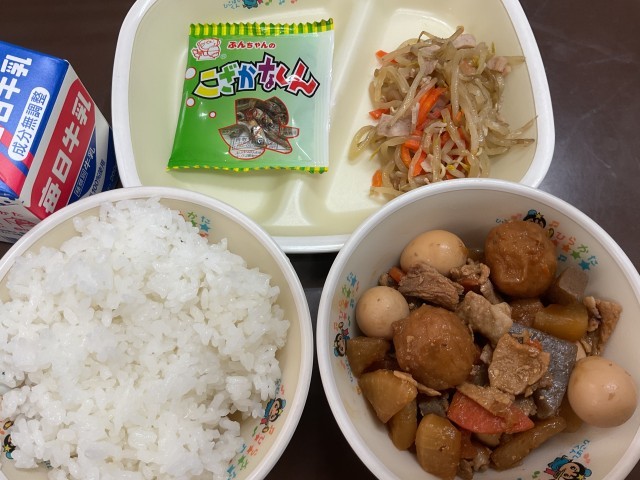 【献立】みそおでん・もやしのいためもの・ミニフィッシュ・ごはん・牛乳