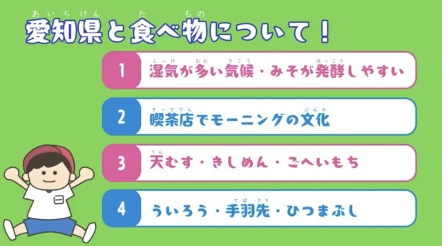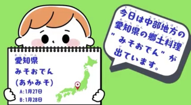 給食週間3日目は、愛知県の郷土料理「みそおでん」です。普段のみそおでんと違うところは、愛知県で有名な「赤みそ」を使っているところです。赤みそは独特なコクやしぶみ、さんみがとくちょうで、おでんに深みを与えてくれます。あつあつおでんとごはんの相性がバッチリでとてもおいしかったです。