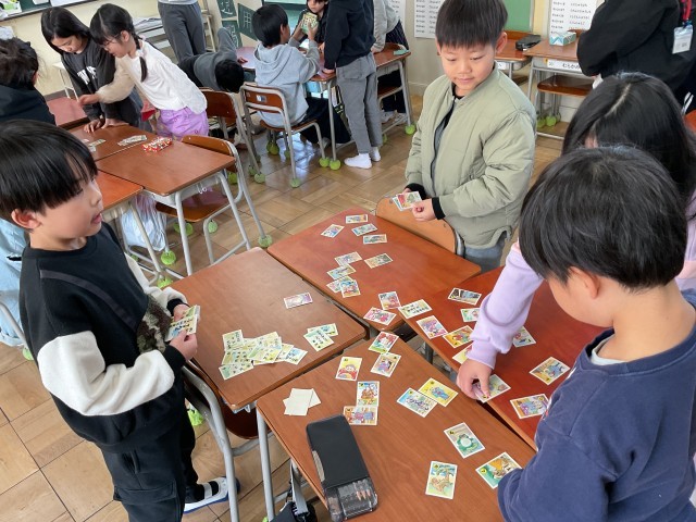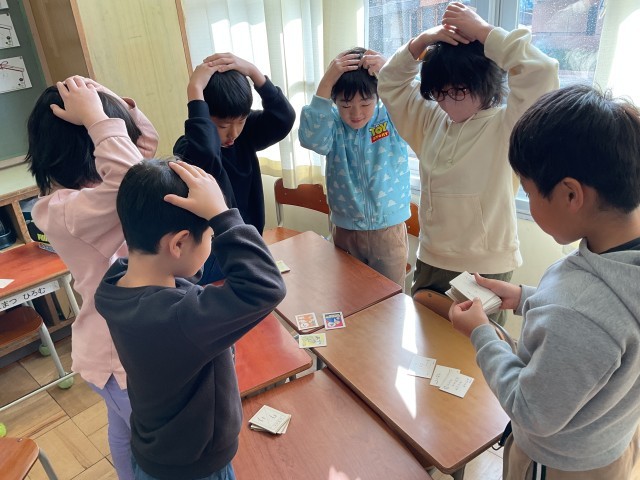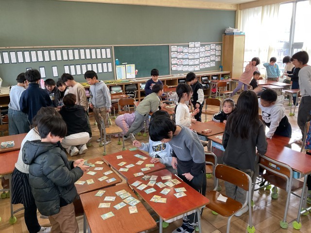 カルタ合戦会です。読み手の声に合わせて「ハイ!」との声と「パチン」との札をとる心地よい音が教室に広がっていましたね😄たくさんとることはできましたか?