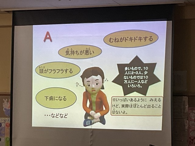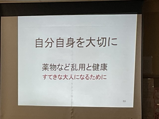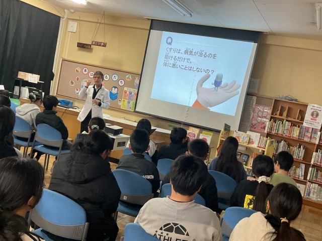 薬剤師さんにきていただき、薬の効果や薬との向き合い方、薬物を体に入れることでの影響など、多くの視点で教えていただきました。自分の体だけでなく、家族や友人に与える影響など、大人に近づくための貴重な時間を共有することができました。