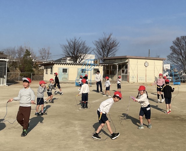 二つのグループに分かれて、なわとびの練習とサッカーボールになれる取り組みです。ボールがどこに転がるかは、ボールをける力の加減を知ることです。楽しくのびのびと活動していました。