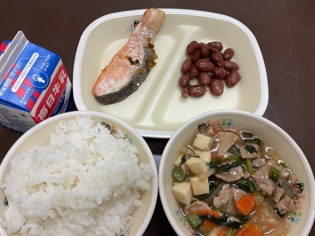 今日の大おかずは、たっぷりの豆腐や、冬においしい大根、他にもおいしい野菜をたっぷり使い、調理員さんがおいしくとってくれた出汁で煮込まれていました。トロットしたあんがかかっているので冷めにくく、寒い体を温めてくれること間違いなしでした。大人気、さけのネギだれと一緒においしくいただきました。