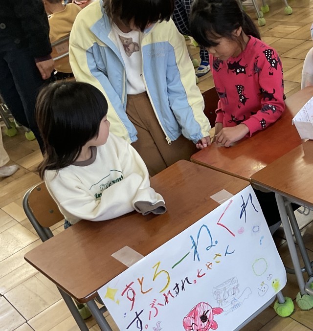 桜丘北保育園のみなさんとの交流会でした。前半は体育館で学習発表会の練習をみてもらいました。後半は教室で、用意していた「お店やさん」のお客さんとして楽しく交流ができたようです。いつも以上に積極的な様子がたくさんみられました😃
