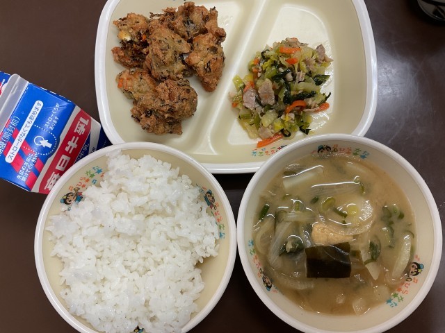 【献立】みそしる・けんちんあげ・白菜の塩こうじいため・ご飯・牛乳