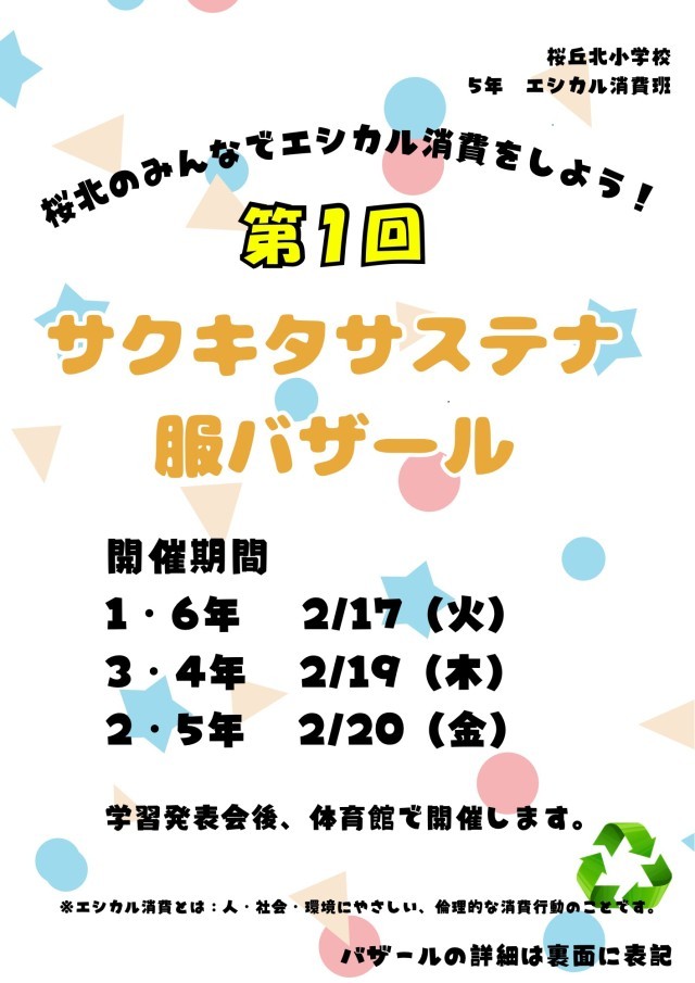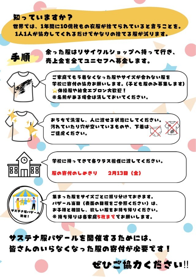 1月8日のまなびポケットでお知らせしている「授業参観(学習発表会)」と5年生の取り組みである「服バザール」のご協力依頼のお知らせです。あらためてご確認ください。