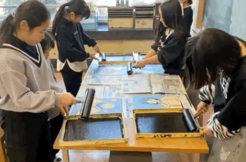 自画像の写真を参考にして、ダイナミックな版画が完成しているようです。墨をつけるこの瞬間、ドキドキしますね😚