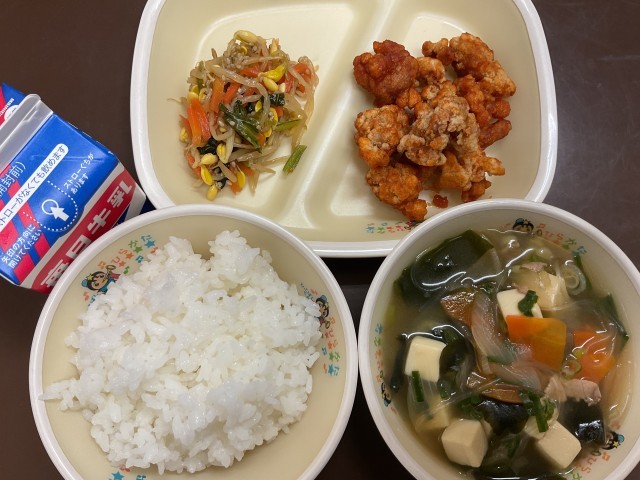 【献立】わかめスープ・ヤンニョムチキン・もやしのナムル・ご飯・牛乳