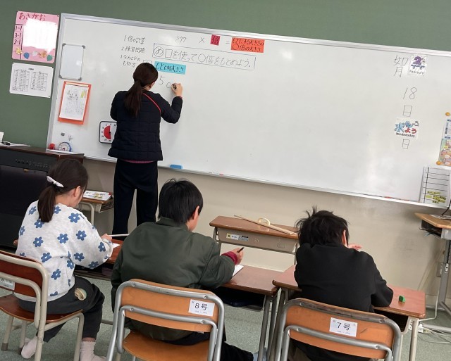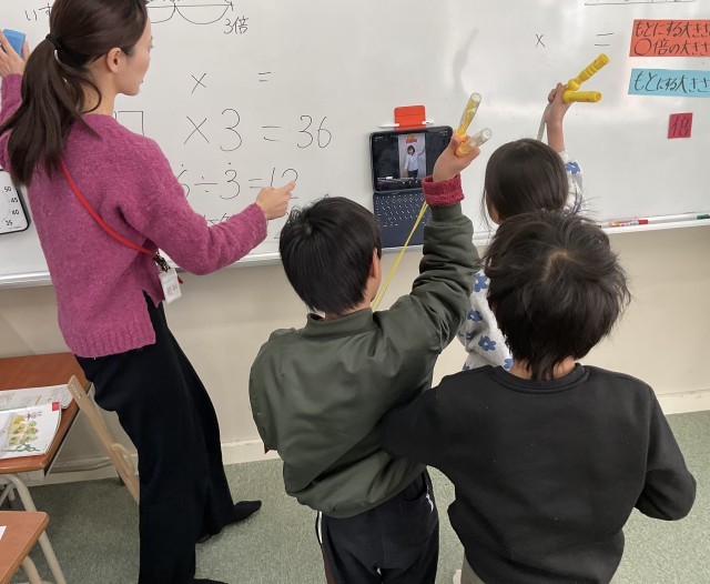 身近にある具体的な物を使い、何倍かを?図や⬜︎を使って学習を進めています。「机のたての長さは、消しゴムの長さの何倍ですか?」をかけ算・わり算で取り組んでいました。授業の後半では、なわとびのまとめ方について動画で確認して体育の授業につながる時間となりました。