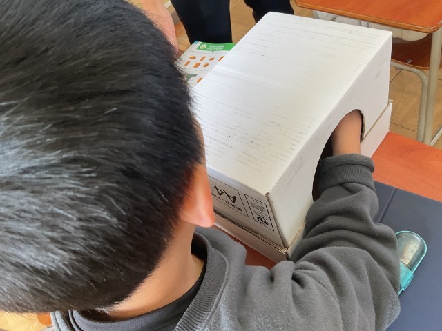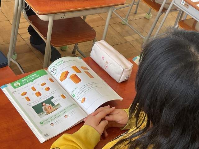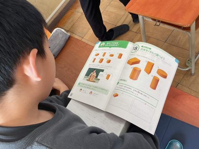 「角柱と円柱」では、平面だけで囲まれている立体に共通する性質を調べるために、箱の中の具体物が何かをあてる取り組みからスタートしていました。立体のグループ分けでは、友だち同士の活発な意見が盛り上がっていましたね。