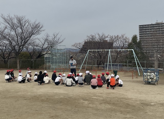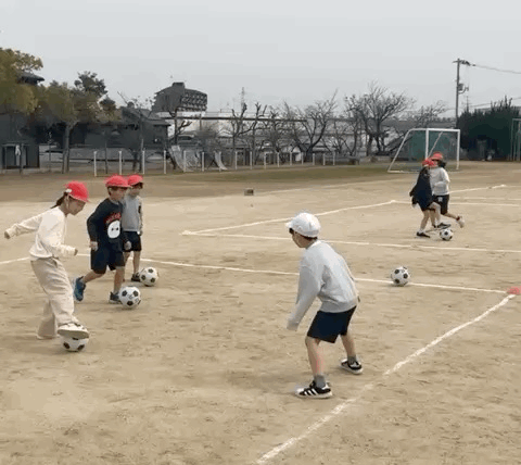 チームに分かれて、ドリブルしながら、ボールを取られないようにゴール前まで運ぶ練習でした。しっかりとボールを見て相手を抜き去ると達成感がありますね。