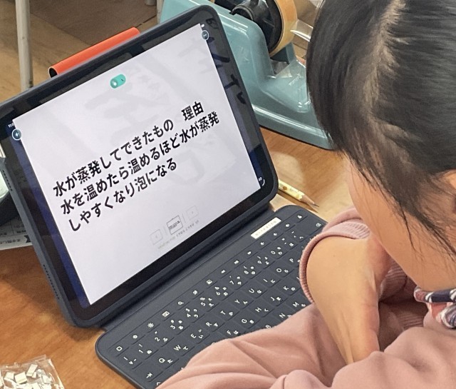 水を温め続けると「泡」が出てきます。この「泡」の正体は何かを考え、意見を共有していました。では説明してください!と言われると応え方をじっくり考える場面になります。次は実際に実験して答えを導く予定です。