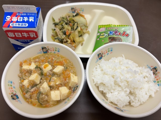 ひき肉たっぷりの麻婆豆腐は、ご飯が進むメニューです。小松菜の胡麻炒めに入っていた野菜も彩りもよく、ゴマの風味も効いてとても美味しかったです。【献立】麻婆豆腐・小松菜の胡麻炒め・ミニフィッシュ・ご飯・牛乳