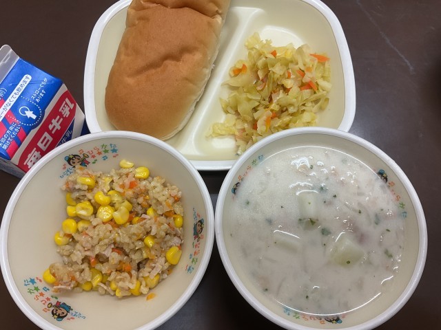 【献立】いんげん豆のクリームスープ・ライスソテー・ラハノサラタ・コッペパン・牛乳