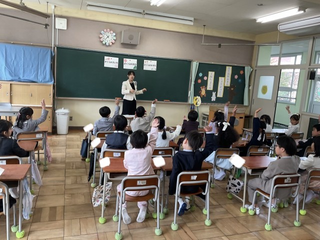 式後は担任の先生から改めてのクイズ自己紹介があり、式の時よりも元気に答えていました。