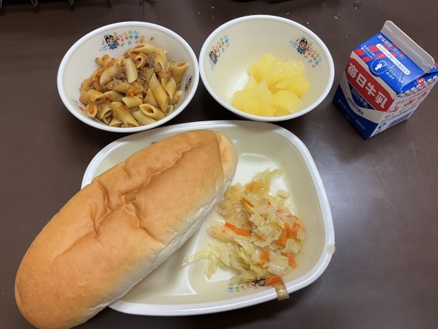 いよいよ給食が始まりました!今日の給食はミートペンネです。パスタと違って弾力があって、とても美味しかったです。デザート(りんごの缶詰)があるのも、嬉しいですね。【献立】ミートペンネ、ラハノサラタ、コッペパン、りんごの缶詰、牛乳