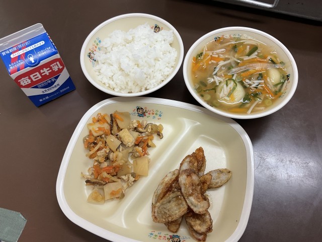 今日の給食はふきごはんです。春を感じることができるふきですが、苦手な子どもが多いので、調理員さん達は苦味も美味しくなるように工夫してくれているので、とても美味しかったです。【献立】ふきごはん、揚げごぼうのごまだれ、じゃがいももちのお汁、牛乳