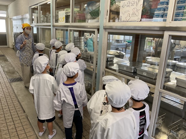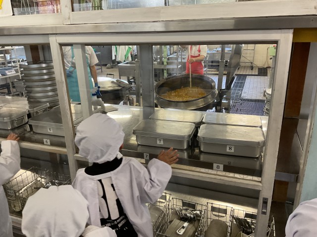 給食準備を早くし過ぎた1年生に、特別に調理場見学をさせてもらいました。大きな鍋のカレーを混ぜている様子を見た1年生は「すご〜い!」と驚いていました。給食の美味しさの秘密を少し知れて、喜ぶ1年生でした。