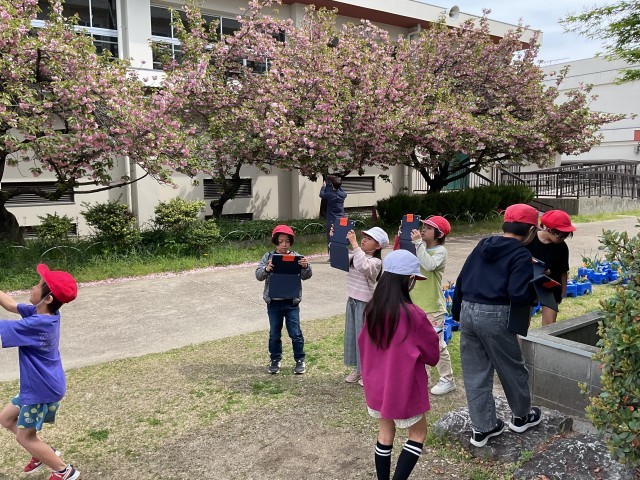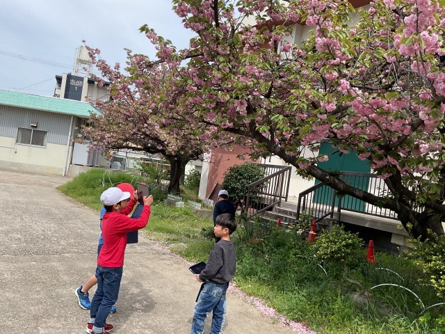 校務員さんが育ててくれているお花を中心に、まだ残っている八重桜を撮影します。